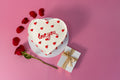 1 kg . A heart-shaped cake with a heartfelt message, accompanied by roses for a classic Valentine's surprise.