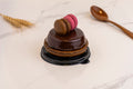 استمتع بكعكة موس الماكرون الخاصة بنا - موس الشوكولاتة البلجيكي الغني، وكريمة الشوكولاتة الداكنة المخملية، والكريمة المخفوقة اللذيذة، والمغطاة بالماكرون الرقيق للحصول على الحلوى المثالية.
